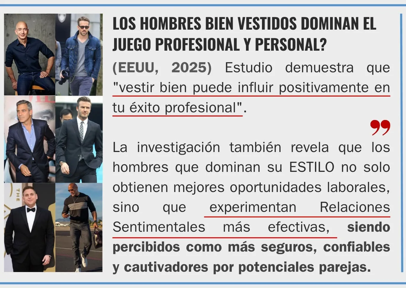 Este fenómeno no es casualidad: Los hombres que dominan su Estilo no solo aceleran su progreso profesional, sino que también mejoran significativamente sus relaciones con las mujeres.